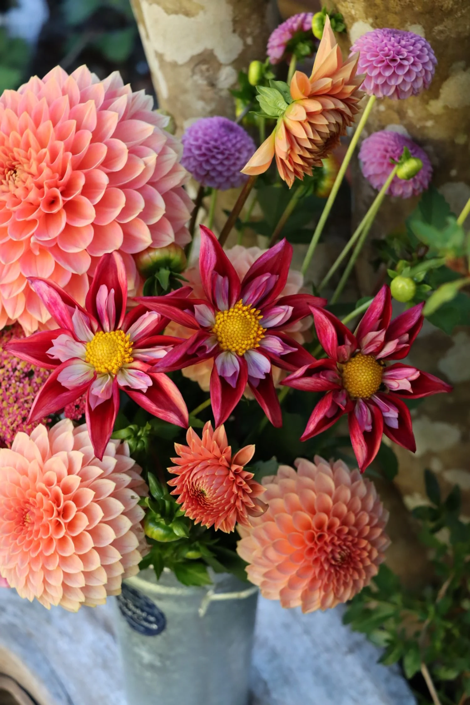 Peachy, yellow, and blushed with perfect form and strong stems! A joy as a cut flower and in the garden. The photo of BQ Alan with the blue sky and palomino clouds was actually one of our rooted cuttings that made flowers about a month before the ones grown from tubers. They also made nice tubers themselves, too.